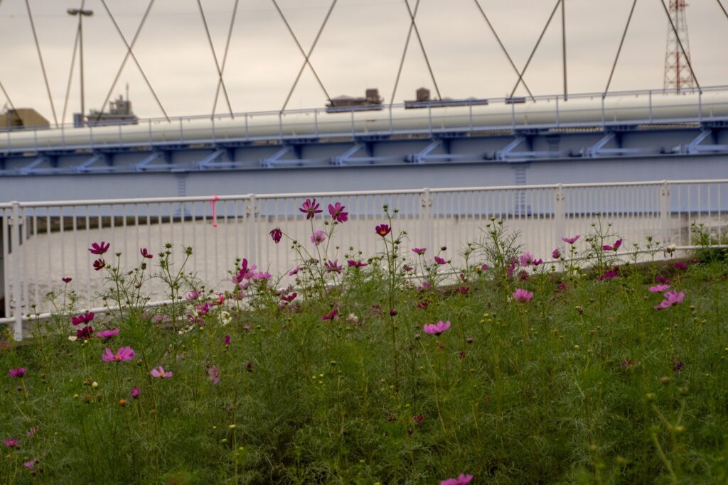 鶴見川沿いのコスモスが秋風にゆれています リバーサイドガーデンのコスモスがようやく咲き始めました!!